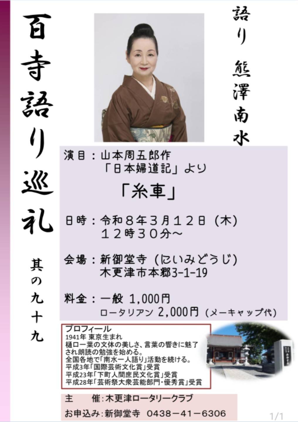 熊澤南水さんの『百寺語り巡礼』99ヶ寺目として、藤平会員が住職をつとめる新御堂寺で公演が行われました。