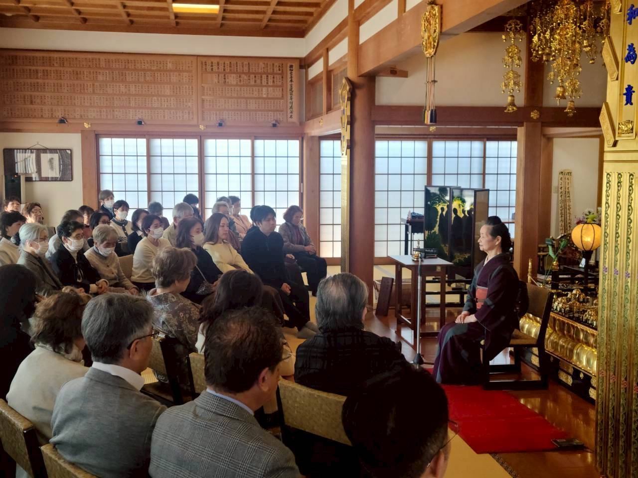 熊澤南水さんの『百寺語り巡礼』99ヶ寺目として、藤平会員が住職をつとめる新御堂寺で公演が行われました。